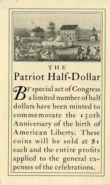 Like in 1900, a commemorative coin was minted for the occasion. Because the 150th anniversary was a significant one, the United States Mint produced the Commemorative Patriot Half-Dollar, a silver half-dollar coin representing both Concord and Lexington. The front of the coin depicts the Minute Man statue, while the back depicts Lexington's Old Belfry.