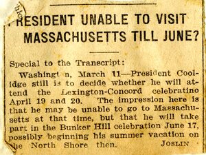 Uncertainty about President Calvin Coolidge's attendance at both the Concord and Lexington 150th anniversary celebrations persisted for several months leading up to April 19th. Local newspapers kept the community abreast of each update provided by Concord and Lexington's respective planning committees. Ultimately, Coolidge was unable to attend any of the April 19th celebrations and sent Vice President Charles Dawes in his place. Many other state and local dignitaries were also in attendance.
