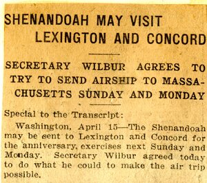 President Coolidge was not the only visitor with a busy schedule considered by the Sesquicentennial Committee. Initially, the Committee was in talks with the US Navy to send the USS Shenandoah, an airship, to fly over Concord and Lexington. Ultimately, the Shenandoah was unable to attend due to scheduling conflicts, but the USS Los Angeles, another airship, did make the journey. The Los Angeles followed Paul Revere's route and passed over both Lexington and Concord.