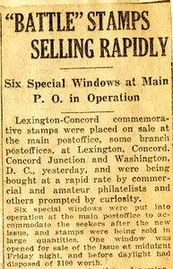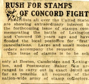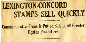 Following tradition, the US Postal Service produced a commemorative stamp for the 150th anniversary of the Battles of Lexington and Concord. The issue, or release, of the stamp was highly anticipated by collectors and covered extensively by local news sources. The stamp received a midnight release, and Boston's main post office opened six additional service windows to accommodate the sheer volume of buyers. Commemorative stamps have continued to be produced in honor of these anniversaries, including one for the 2025 Semiquincentennial.