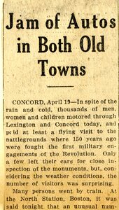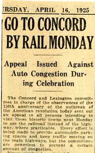 In 1925, car ownership was increasing exponentially. Local railroads had a history of providing special trains and increased service for major Concord Fight anniversaries, and out-of-town visitors were highly encouraged to take the train to Concord, rather than drive. Newspapers published information about the increased train schdules and encouraged people to use public transit rather than cause excessive traffic. Some, but not all, took this advice.