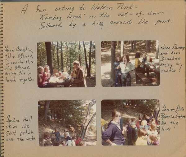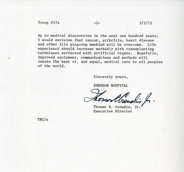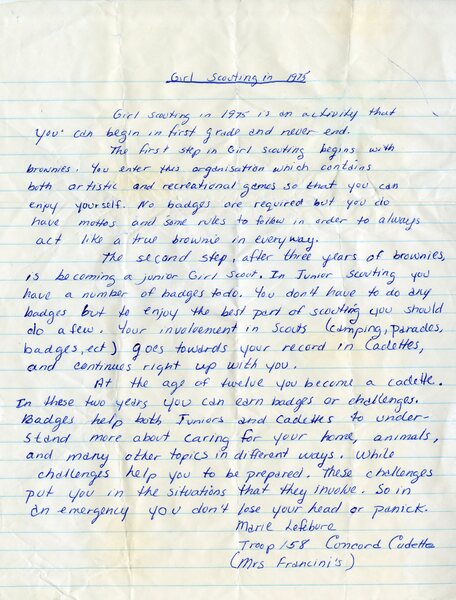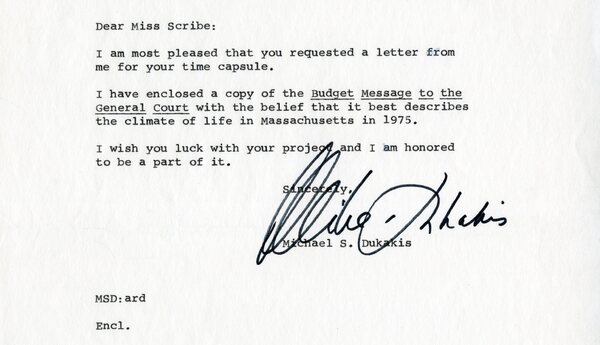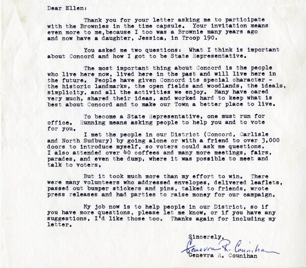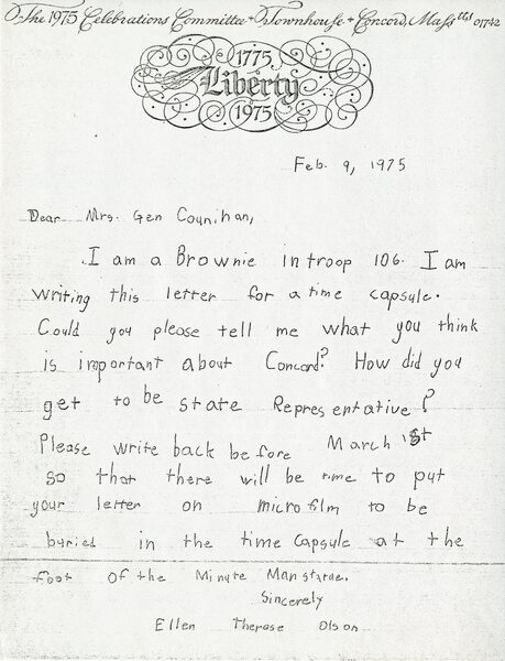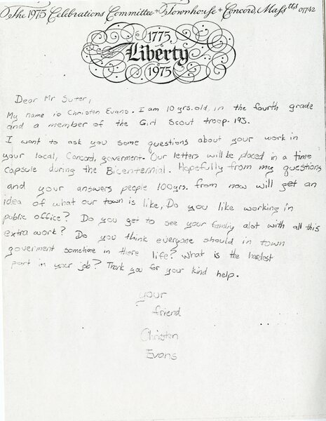 Compiling a time capsule representing life in Concord in 1975 was assigned to Concord's 25 Girl Scout troops. Each troop wrote letters to selected individuals representing the town, region, state, and country. Each recipient was asked to describe their profession and responsibilities and what life was like for them in 1975. Recipients were divided into ten categories: town officials, elder leaders, people in public life, Concord Honored Citizens, Concord business owners and descendants of historical and literary figures, historians, artists and writers, clergy, scientists, and former Girl Scouts.