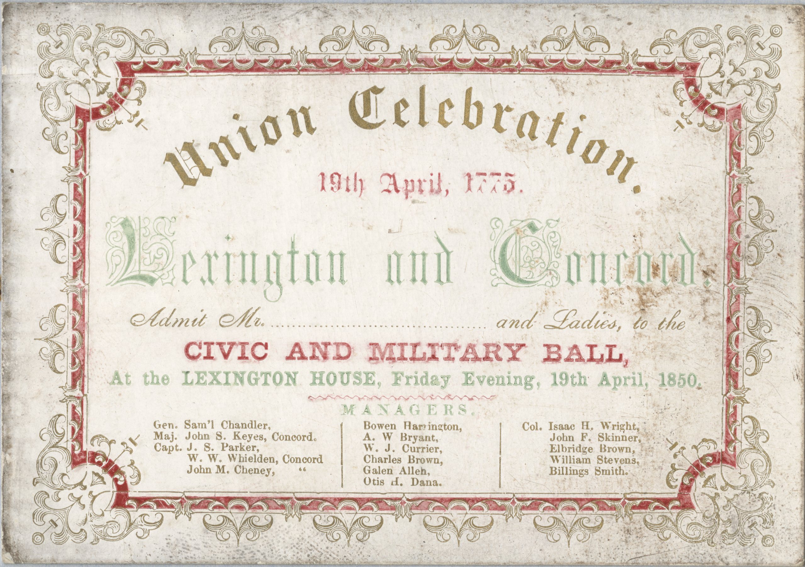 Image description: A ticket to the joint Concord and Lexington civic and military ball in 1850. Printed on white paper, a decorative red and gold border frames the following text: "Union Celebration. 19th April, 1775. Lexington and Concord. Admit Mr. and Ladies to the Civic and Military Ball, at the Lexington House, Friday evening, 19th April, 1850."