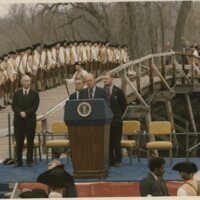 Image description: A color photograph of President Gerald Ford speaking at the North Bridge. Ford stands behind a presidential podium flanked by three other men. Costumed reenactors are lined up on the bridge behind the president. More costumed reenactors and flags are visible in the background.