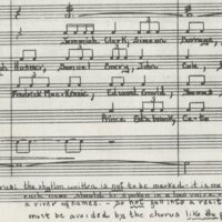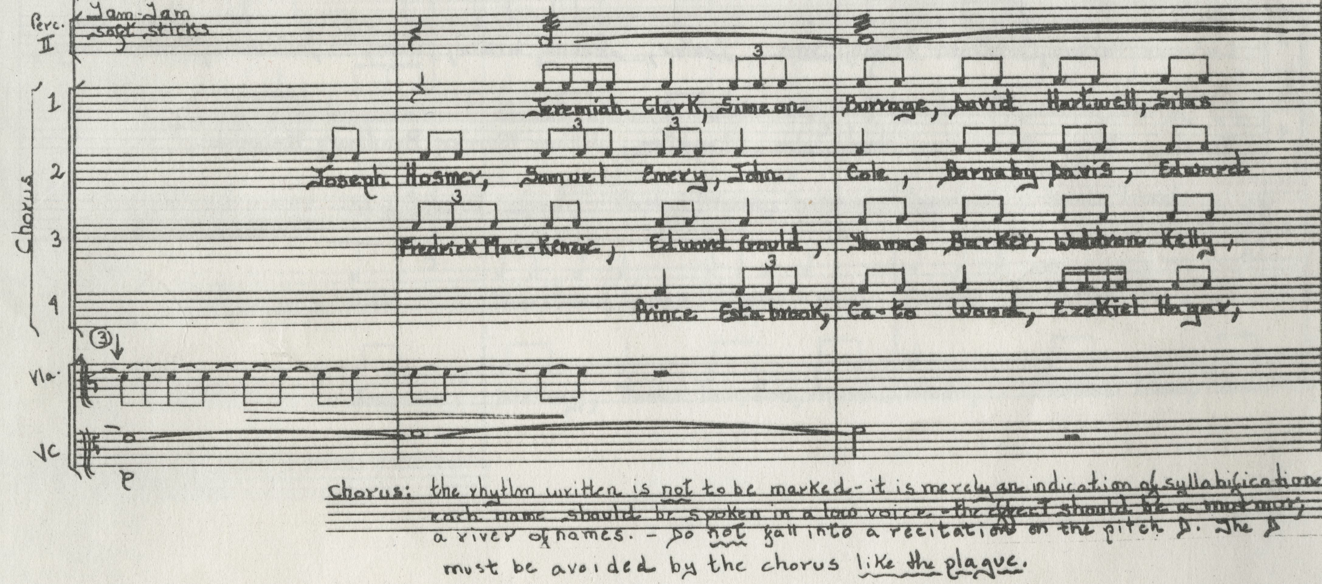 Image description: A portion of a musical score showing black staves on white paper. This excerpt is for percussion and chorus. Text in the top right corner reads "Tam-Tam soft sticks." The chorus's part is a spoken series of names, which include the following: Jeremiah Clark, Simeon Burrage, David Hartwell, Silas Joseph Hosmer, Samuel Emery, John Cole, Barnaby Davis, Edward Fredrick MacKenzie, Edward Gould, Thomas Barker, Waldron Kelly, Prince Estabrook, Cato Wood, Ezekiel Hagar. At the bottom of the page is a performance note: "Chorus: The rhythm written is not to be marked—it is merely an indication of syllabification. Each name should be spoken in a low voice—the effect should be a murmur, a river of names. Do not fall into a recitation on the pitch D. The D must be avoided by the chorus like the plague."