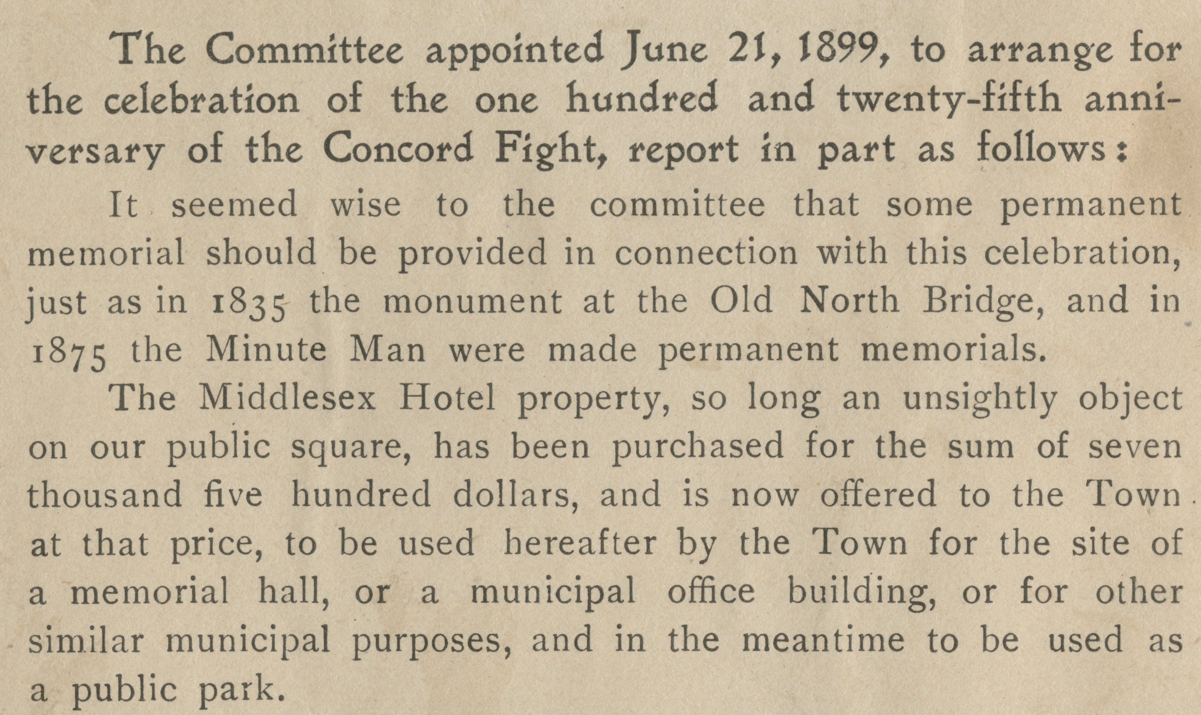 The Middlesex Hotel property, so long an unsightly object on our public square, has been purchased for the sum of seven thousand five hundred dollars, and is now offered to the Town at that price, to be used hereafter by the Town for the site of a memorial hall, or a municipal office building, or for other similar municipal purposes, and in the meantime to be used as a public park.