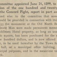 The Committee appointed June 21, 1899, to arrange for the celebration of the one hundred and twenty-fifth anniversary of the Concord Fight, report in part as follows: It seemed wise to the committee that some permanent memorial should be provided in connection with this celebration, just as in 1835 the monument at the Old North Bridge, and in 1875 the Minute Man were made permanent memorials.