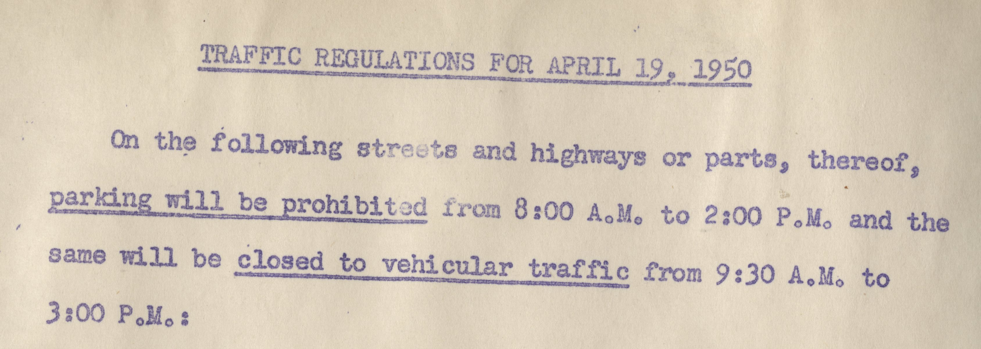On the following streets and highways or parts, thereof, parking will be prohibited from 8:00 A.M. to 2:00 P.M. and the same will be closed to vehicular traffic from 9:30 A..M. to 3:00 P.M.