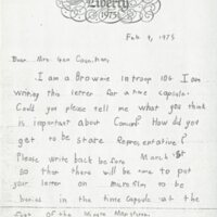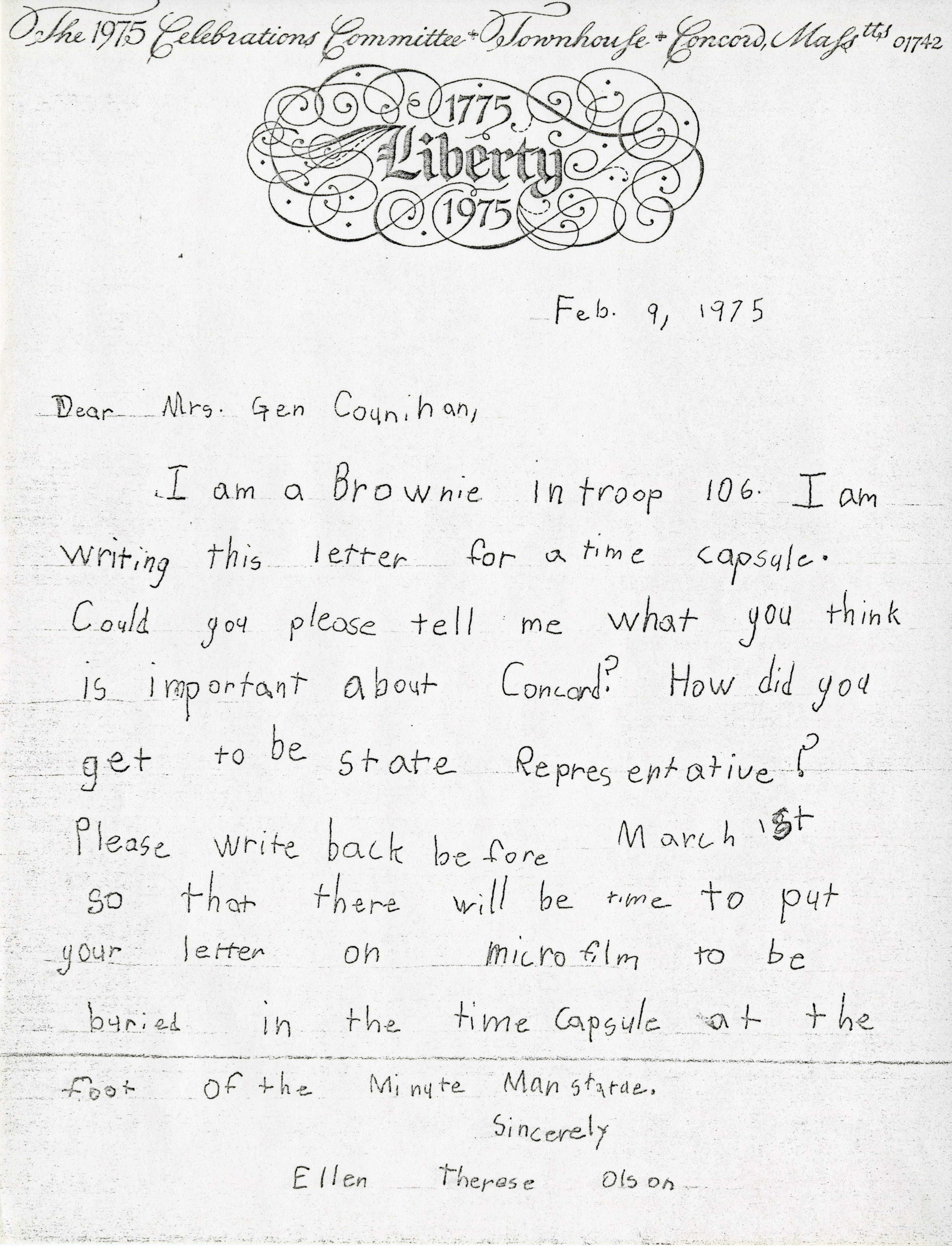 I am a Brownie in troop 106. I am writing this letter for a time capsule. Could you please tell me what you think is important about Concord? How did you get to be State Representative? Please write back before March 1st so that there will be time to put your letter on microfilm to be buried in the time capsule at the foot of the Mintue Man statue.