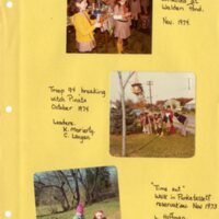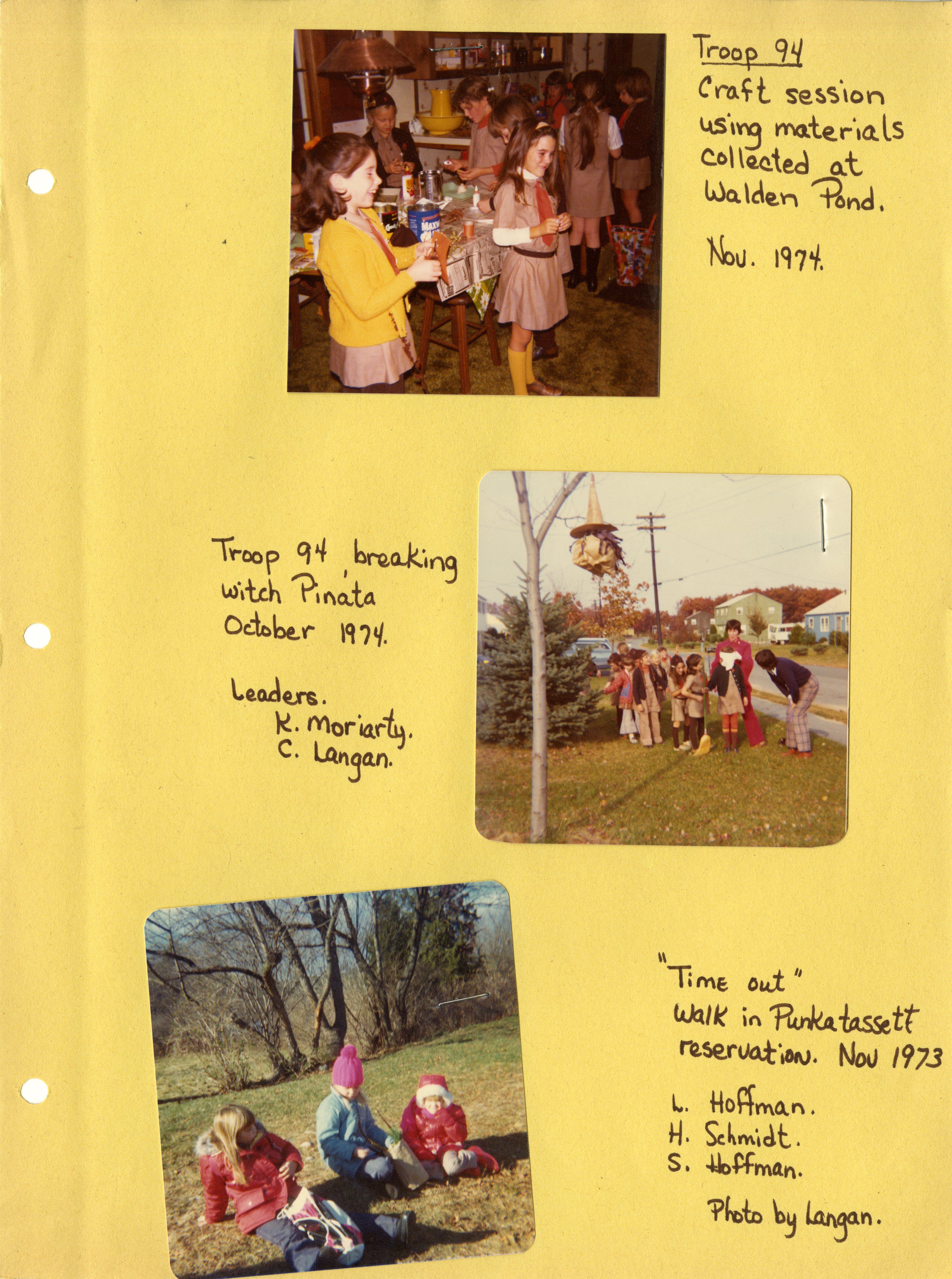 Image description: Three color photographs are pasted on yellow construction paper. The first photograph shows girls in Brownie uniforms laughing. Handwritten next to the photo is the following text: "Troop 94. Craft session using materials collected at Walden Pond. Nov. 1974." The second photo shows a group of girls standing under a pinata shaped like a witch. Handwritten next to the photo is the following text: "Troop 94 breaking witch pinata October 1974. Leaders: K. Moriarty, C. Langan." The third photo shows three girls seated on grass and dressed in winter gear. Handwritten next to the photo is the following text: "'Time out' walk in Punkatasset reservation. Nov. 1973. L. Hoffman, H. Schmidt, S. Hoffman. Photo by Langan."