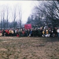 Image description: A large group of protestors stand behind cordons on Buttrick's hillside. A large red banner with "New American Movement" written in black letters is visible in the center of the group.