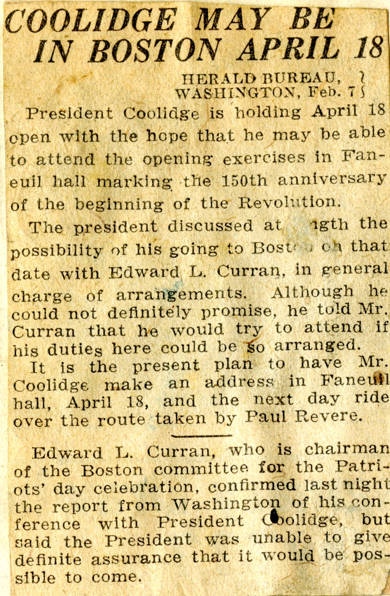 A news clipping from the Washington Herald, possibly reprinted in a local newspaper, announcing that Calvin Coolidge may be attending April 19th festivities in the Boston area.