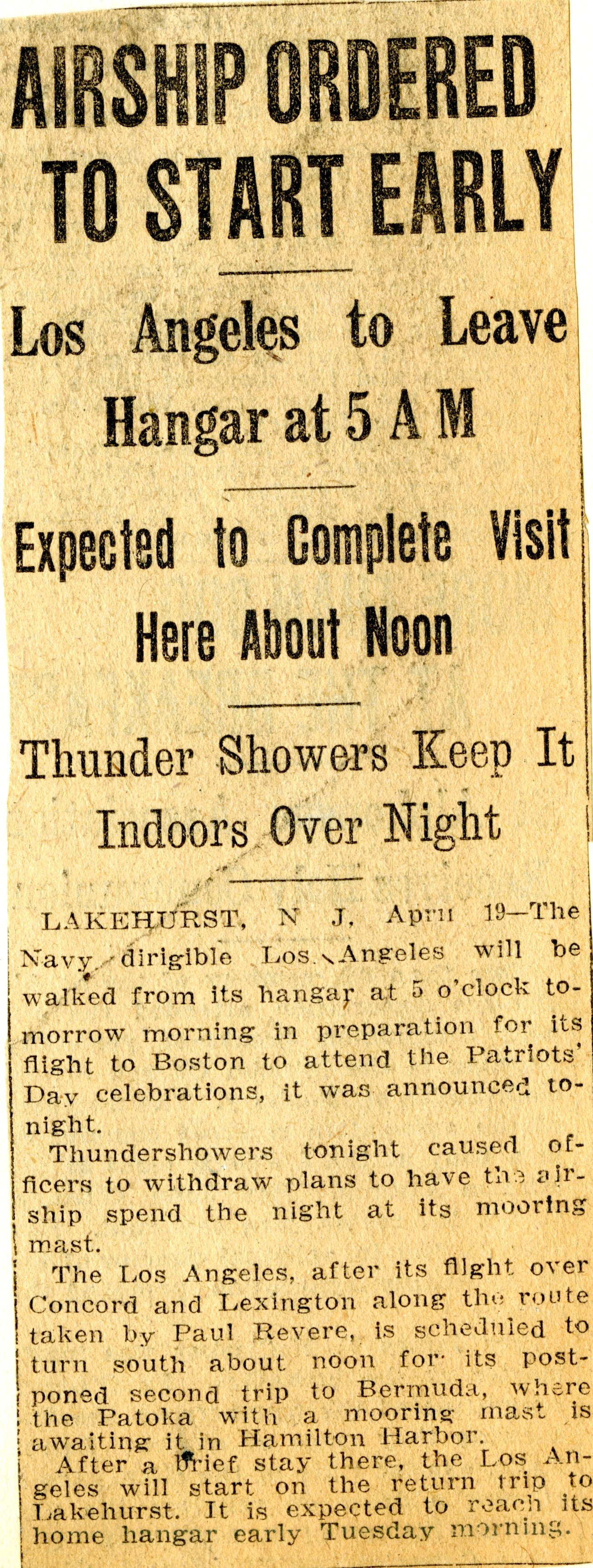 Lakehurst, NJ, April 19—The Navy dirigible Los Angeles will be walked from its hangar at 5 o'clock tomorrow morning in preparation for its flight to Boston to attend the Patriots' Day celebrations, it was announced tonight. Thundershowers tonight caused officers to withdraw plans to have the airship spend the night at its mooring mast. The Los Angeles, after its flight over Concord and Lexington along the route taken by Paul Revere, is scheduled to turn south about noon for its postponed second trip to Bermuda, where the Patoka with a mooring mast is awaiting it in Hamilton Harbor. After a brief stay there, the Los Angeles will start on the return trip to Lakehurst. It is expected to reach its home hangar early Tuesday morning.