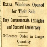 A news clipping from the Boston Post describing the first day of sales for the Lexington-Concord commemorative stamp in 1925.