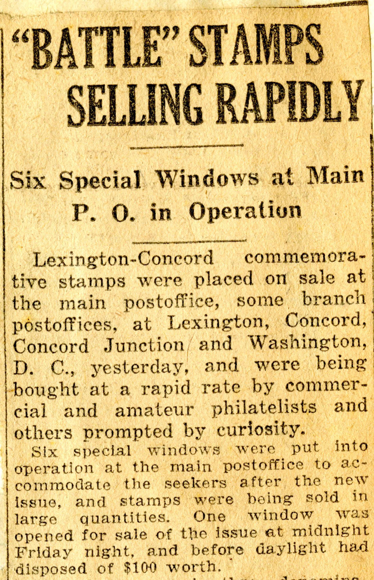 A news clipping from the Boston Post describing the first day of sales for the Lexington-Concord commemorative stamp in 1925.