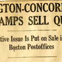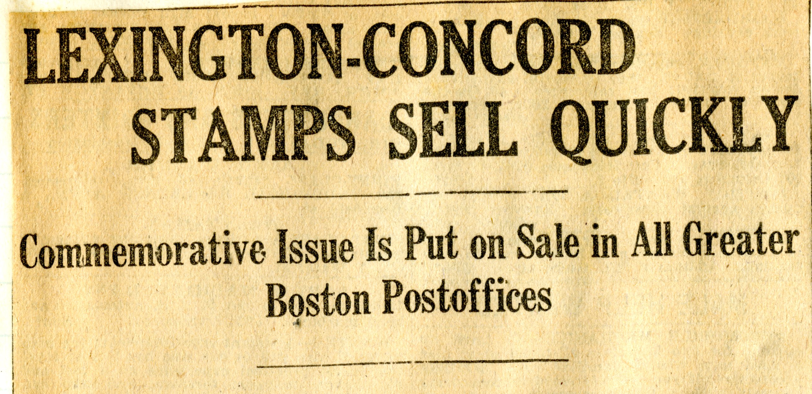 A news clipping from an unknown source announcing that the commemorative Lexington-Concord stamps sold quickly.