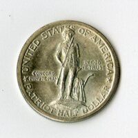 The front side of the Commemorative Patriot Half-Dollar produced by the United States Mint for the 150th anniversary of the Battles of Concord and Lexington. The front of the coin represents Concord while the back represents Lexington.