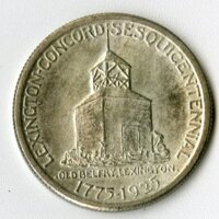 The back side of the Commemorative Patriot Half-Dollar produced by the United States Mint of the 150th anniversary of the Battles of Concord and Lexington.