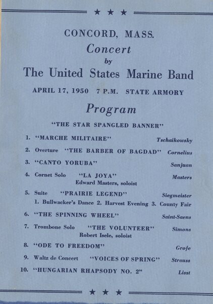 Over the years, several notable ensembles have been asked to play in honor of the Concord Fight. In 1850, the Boston Brass Band was invited to perform for the 75th anniversary celebration. The United States Marine Band played concerts at both the 150th and 175th anniversaries in 1925 and 1950, respectively, playing a mix of classical standards and works by American composers.