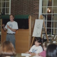 Image description: A color photograph of author Willie Petersen, a white man with red hair wearing a grey shirt and grey pants. He stands at the front of the old CFPL children's book in front of a puppet theater. To the right of Petersen is an easel with a large white sketchpad. On the sketchpad is a drawing of a mouse wearing a striped shirt. In the foreground are a group of children seated at a table.