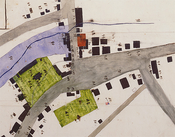 Image description: A hand-drawn and colored map of downtown Concord in the early 19th century. Buildings are numbered and the Mill Brook is included.