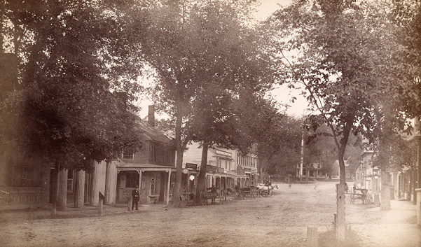 Image description: A black-and-white photograph of the Milldam. The road is unpaved and lined with trees.