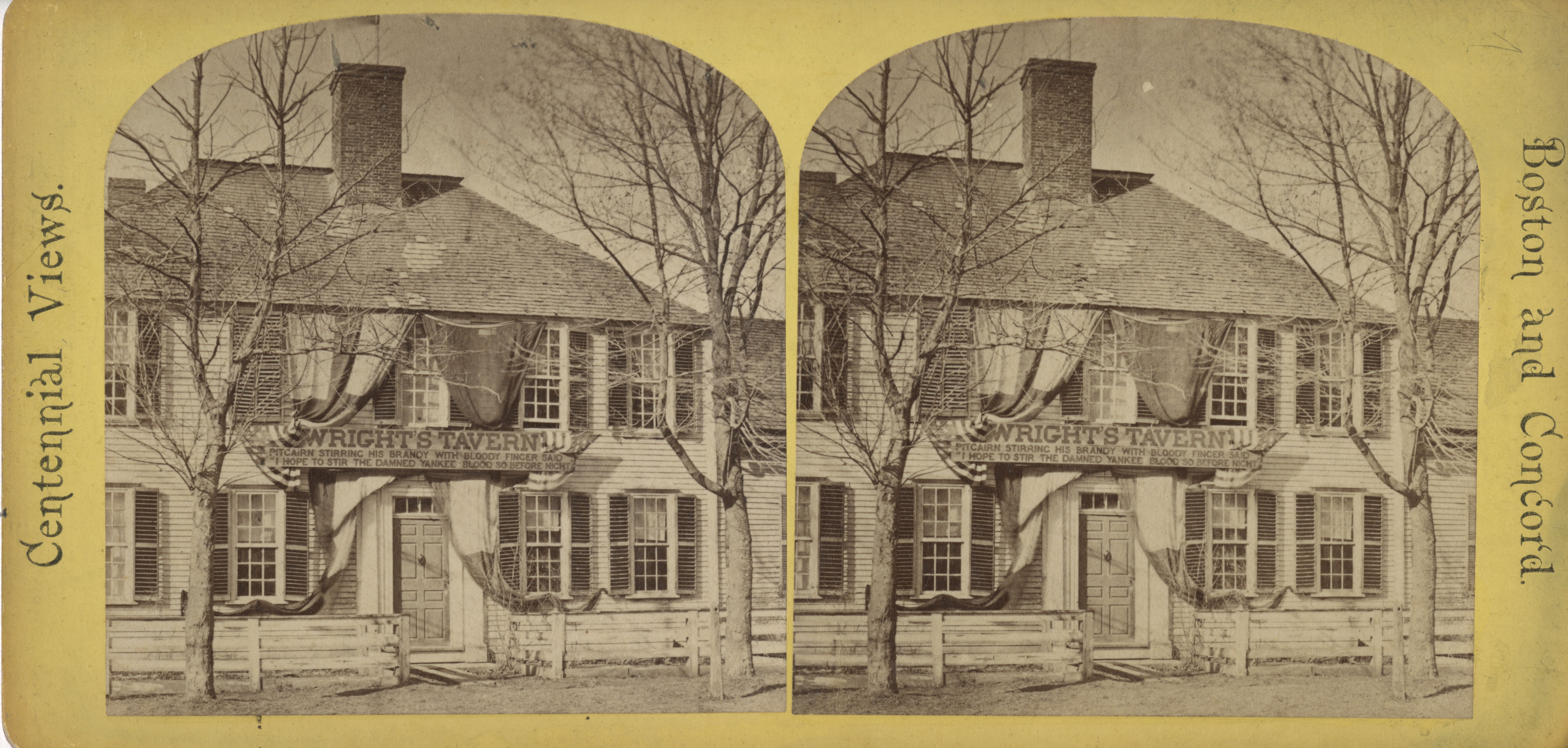 Image description: A black-and-white stereograph of Wright's Tavern, a colonial-style building flanked by trees. The tavern is decorated with an informative banner reading "Pitcairn stirring his brandy with bloody finger said 'I hope to stir the damned Yankee blood so before night.'"
