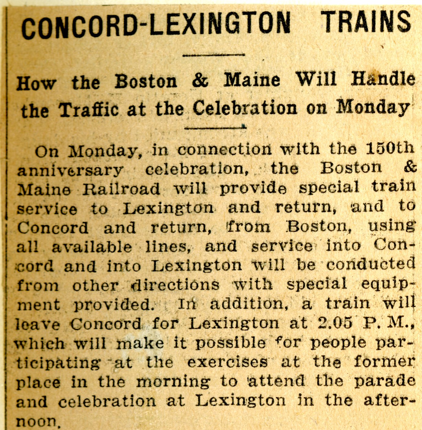 On Monday, in connection with the 150th anniversary celebration, the Boston & Maine Railroad will provide special train service to Lexington and return, and to Concord and return, from Boston, using all available lines, and service into Concord and into Lexington will be conducted from other directions with special equipment provided. In addition, a train will leave Concord for Lexington at 2.05 P. M., which will make it possible for people participating at the exercises at the former place in the morning to attend the parade and celebration at Lexington in the afternoon.