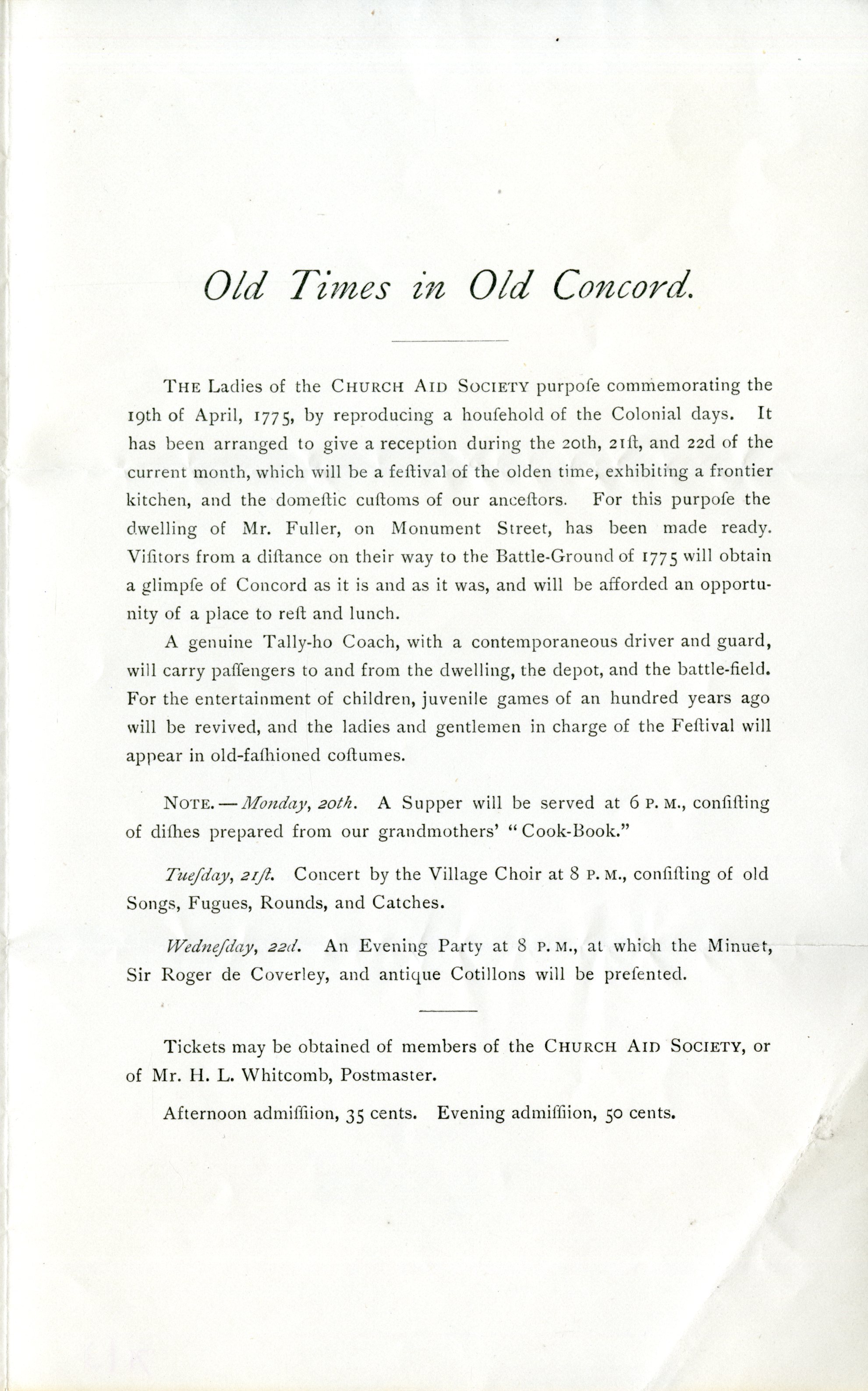 The Ladies of the Church Aid Society purpose commemorating the 19th of April, 1775, by reproducing a household of the Colonial days. It has been arranged to give a reception during the 20th, 21st, and 22nd of the current month, which will be a festival of the olden time, exhibiting a frontier kitchen, and the domestic customs of our ancestors. For this purpose the dwelling of Mr. Fuller, on Monument Street, has been made ready. Visitors from a distance on their way to the Battle-Ground of 1775 will obtain a glimpse of Concord as it is and as it was, and will be afforded an opportunity of a place to rest and lunch.