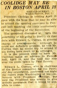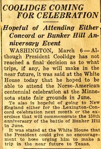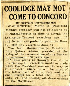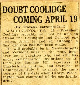 Uncertainty about President Calvin Coolidge's attendance at both the Concord and Lexington 150th anniversary celebrations persisted for several months leading up to April 19th. Local newspapers kept the community abreast of each update provided by Concord and Lexington's respective planning committees. Ultimately, Coolidge was unable to attend any of the April 19th celebrations and sent Vice President Charles Dawes in his place. Many other state and local dignitaries were also in attendance.