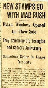 Following tradition, the US Postal Service produced a commemorative stamp for the 150th anniversary of the Battles of Lexington and Concord. The issue, or release, of the stamp was highly anticipated by collectors and covered extensively by local news sources. The stamp received a midnight release, and Boston's main post office opened six additional service windows to accommodate the sheer volume of buyers. Commemorative stamps have continued to be produced in honor of these anniversaries, including one for the 2025 Semiquincentennial.