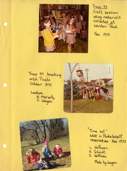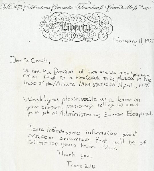 Compiling a time capsule representing life in Concord in 1975 was assigned to Concord's 25 Girl Scout troops. Each troop wrote letters to selected individuals representing the town, region, state, and country. Each recipient was asked to describe their profession and responsibilities and what life was like for them in 1975. Recipients were divided into ten categories: town officials, elder leaders, people in public life, Concord Honored Citizens, Concord business owners and descendants of historical and literary figures, historians, artists and writers, clergy, scientists, and former Girl Scouts.
