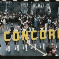 Image description: A color photograph of the 1975 parade. Students carry large yellow letters spelling "Concord."