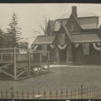 Image description: A black-and-white photograph of the Concord Free Public Library taken from the front at the intersection of Main Street and Sudbury Road. The exterior of the library is decorated with flags and bunting. There is a wooden bandstand on the grass in front of the building.