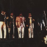Image description: A color photograph of the Persuasions performing at the People's Bicentennial Commission rally. The image shows five African American men singing at individual microphones.
