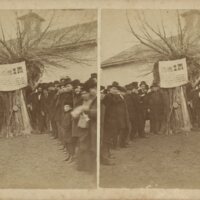 Image description: A black-and-white stereograph of a group of people posed around the Continental Tree, decorated with a banner.