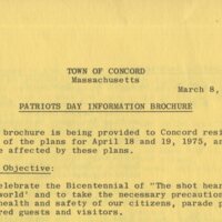 This brochure is being provided to Concord residents to inform them of the plans for April 18 and 19, 1975, and how they will be affected by these plans.