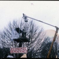 A color photograph of a scaffold at the PBC protest. A sign reading "Economic Democracy" hangs on the scaffold.
