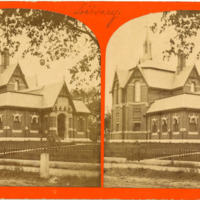 Image description: A black-and-white stereoscopic photograph of the Concord Free Public Library. The photo is taken from the Sudbury Road side, and the front and side of the original building are visible.