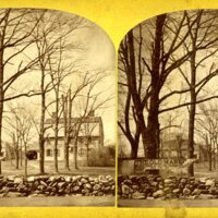 Image description: A stereoscopic photograph of the Old Manse in 1875. As with other historical locations at the time, a large sign noting its significance was placed in front. The sign notes that the Old Manse was the "House of Rev. Wm. Emerson, April 19, 1775."