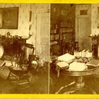 Image description: A black-and-white stereoscopic photograph showing a portion of Ralph Waldo Emerson's study. A round table and chair sit in the foreground with piles of books and papers on the table. Behind the table is a fireplace with a decorated mantle and a painting hanging on the wall above it. In the background is the door and a bookshelf.