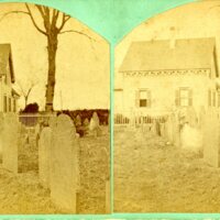 Image description: A black-and-white stereograph showing part of the Old Hill Burying Ground with a small house and fence in the background.