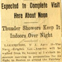 Lakehurst, NJ, April 19—The Navy dirigible Los Angeles will be walked from its hangar at 5 o'clock tomorrow morning in preparation for its flight to Boston to attend the Patriots' Day celebrations, it was announced tonight. Thundershowers tonight caused officers to withdraw plans to have the airship spend the night at its mooring mast. The Los Angeles, after its flight over Concord and Lexington along the route taken by Paul Revere, is scheduled to turn south about noon for its postponed second trip to Bermuda, where the Patoka with a mooring mast is awaiting it in Hamilton Harbor. After a brief stay there, the Los Angeles will start on the return trip to Lakehurst. It is expected to reach its home hangar early Tuesday morning.