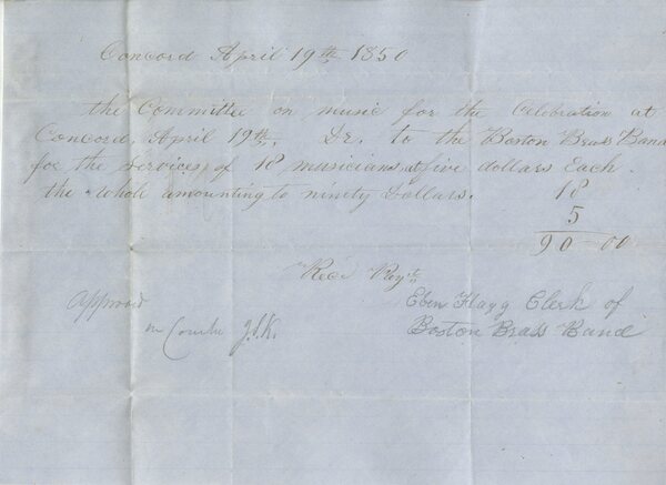 Over the years, several notable ensembles have been asked to play in honor of the Concord Fight. In 1850, the Boston Brass Band was invited to perform for the 75th anniversary celebration. The United States Marine Band played concerts at both the 150th and 175th anniversaries in 1925 and 1950, respectively, playing a mix of classical standards and works by American composers.
