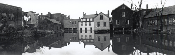 These panoramic views by Concord Road Commissioner Theodore Lincoln Smith were taken a few weeks later on March 21, as the Concord River continued to rise and flooding recurred. The 1936 Concord Town Report stated that buildings on the south side of the Milldam flooded because the drainage system was overwhelmed, but those on the north side experienced “trouble for which there is no local remedy.”