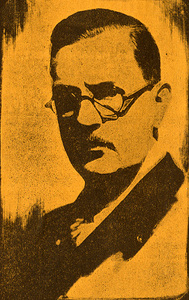 A copy of a photograph of Leslie Anderson printed on orange paper. Anderson is a middle-aged man with dark hair, round glasses, and a mustache.
