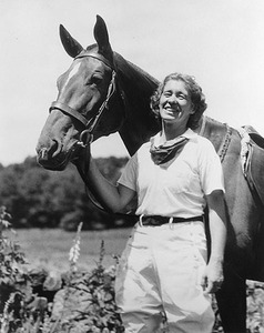 Image description: A black-and-white photograph of Esther Howe Wheeler, a middle-aged woman wearing a t-shirt and pants. She poses next to a horse and smiles.