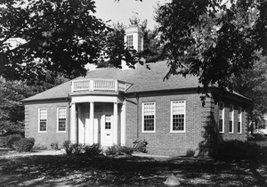 Image description: A black-and-white photograph of the Fowler Branch of the Concord Free Public Library, a small, single-story brick building. There is a cupola with a weathervane on the roof and four columns in front of the door.