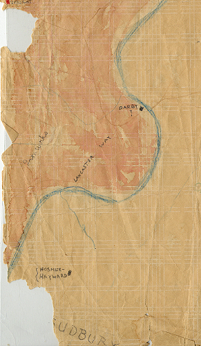 The image on this page shows the West Concord section of a map of the town around 1690, hand-drawn by local historian Ruth Robinson Wheeler.