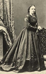 Image description: A black-and-white portrait photograph of a woman. She has dark hair and stands leaning against a chair. She wears a long, dark dress with a large skirt.